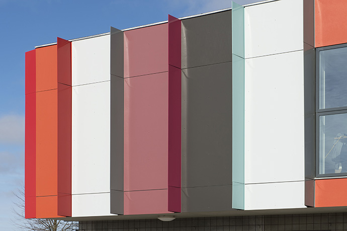 Fibercementpladerne suppleres af lodrette, bukkede alulameller, som er monteret retvinklet på facaden og pulverlakerede i samme farver som facadepladerne. Disse alufinner tager bygningen væk fra det traditionelle, todimensionelle udtryk.