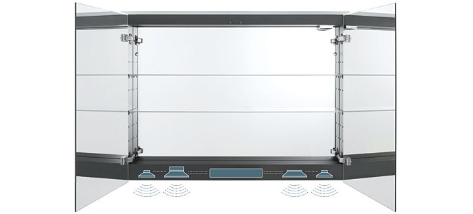 Alle de tekniske komponenter er skjult bag et elegant panel, der kun er 55mm høj. Takket være komponenterne af høj kvalitet og innovativ konstruktion, udviklet specielt til badeværelset, lover systemet en blød ren lyd og en fantastisk surround oplevelse. Spejlskabe fra Delos og X-Large serierne kan også leveres med dette nye lydsystem.