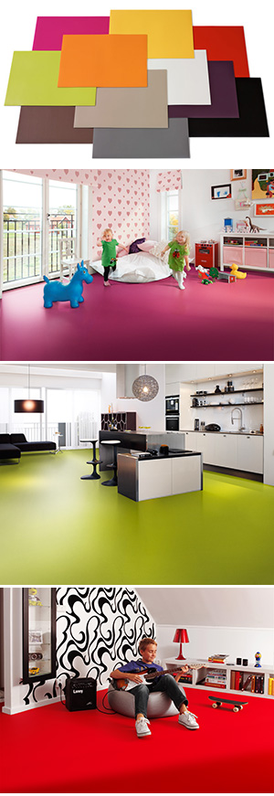 En af årets gulvtendenser er farverige og legesyge gulve. Man kan overraske gæster med en farverig og indbydende entré, et cool teenageværelse eller et kulørt køkken. Tarketts nye kollektion af ensfarvede vinylgulve findes i elleve stærke, klare farver: orange, gul, grøn, rød, magenta, lilla, hvid, beige, grå, brun og sort.