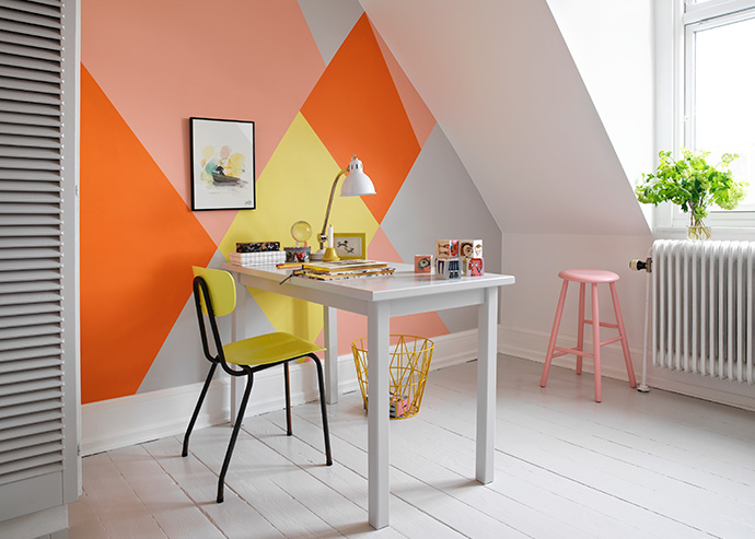 I dette tema er børnene blevet lidt større, og det anbefales at tage børnene med på råd i valget af farver og dekorationer. Vælg barnets yndlingsfarver og dekorer væggen i et flot mønster. Det farverige rum understreges af kulørte møbler, der matcher vægdekorationen.