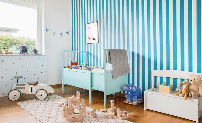 Her tages udgangspunkt i et værelse, der skal fungere for familier med de helt små børn. På væggen er en dekoration med striber, som suppleres af en rolig og matchende farvepalet på møblerne i barnets værelse.