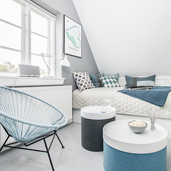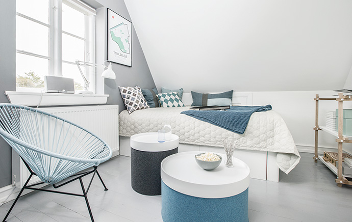 Når man når en alder på 13-14 år og derover er der brug for et hyggeligt værelse, hvor man kan trække sig tilbage og hygge alene eller med vennerne. Paletten På teenageværelset er holdt i neutrale grå farver, fra Dyrups grå og hvide farvekort, og tilsat nuancer af en enkelt farver – her blå.