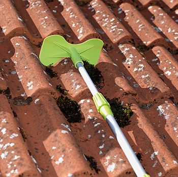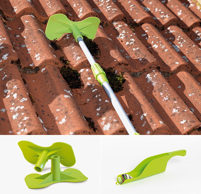 Konceptet består af en specialudformet tagskraber, et teleskopskaft og en øse, Scoop til nedløbsrøret. Vejledende udsalgspris tagskraber 64,95 kr.*, Teleskopskaft 249 kr.* og Scoop 39,95 kr.*