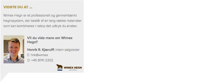Wimex Hegn er et nyt koncept, der byder på en helt ny frihed til at vælge og kombinere forskellige materialer, farver, udtryk og løsninger på tværs af kendte traditioner. Konceptet er gennemtænkt så det giver dig individuelle muligheder, stor fleksibilitet og minimalt vedligehold.