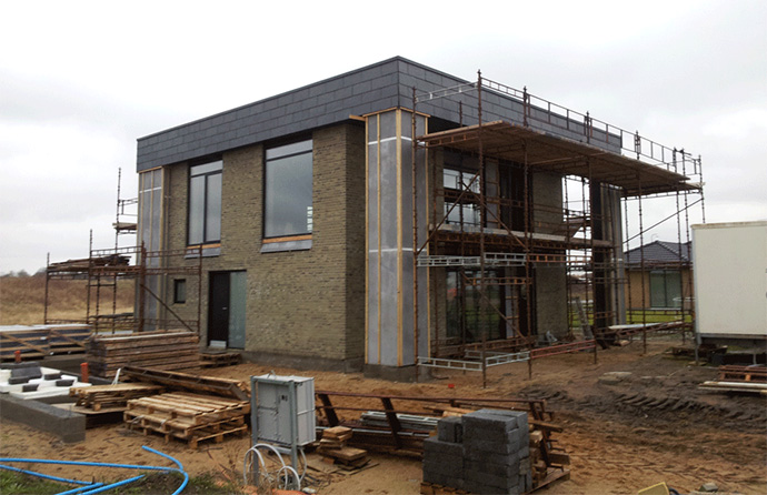 Der er tale om en 198 m2 stor villa i to plan med tagterrasse og en carport på 78m². Byggeriet opføres som lavenergiklasse 2020 i et moderne udtryk med stramme linjer, og der er bærende konstruktioner i træ med facader i håndkløvet naturskifer og grådæmpet teglsten. Som vindspærre er der anvendt i alt 130 ivarit MASTERSHIELD plader af 1200×2490 mm samt 400 meter tape.