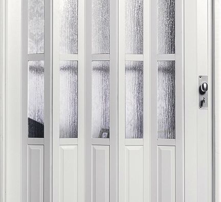 Plastfoldedør type 08 leveres med nøglelås og kraftige pvc listesamlinger.