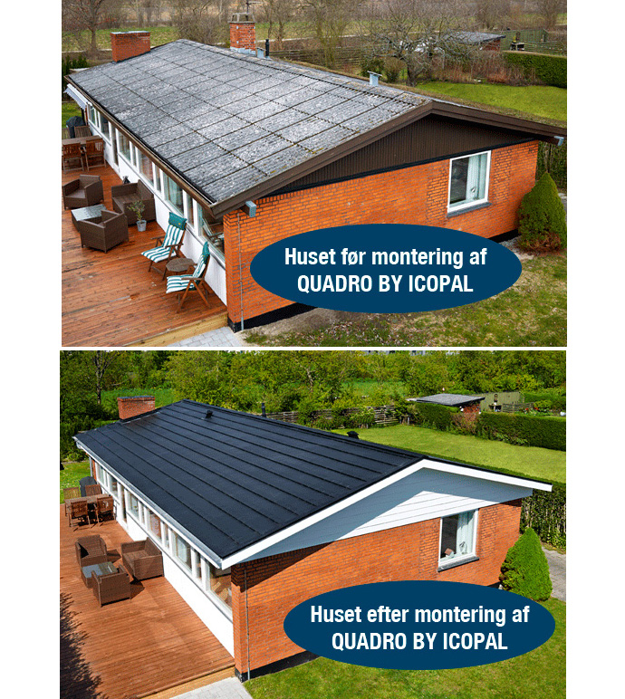 “Ved valget af nyt tag var det vigtigt for mig med et tag med lang levetid og af høj kvalitet,” fortæller husejeren Martin fra Kastrup. “Min kæreste Mia lagde stor vægt på, at taget gerne måtte have et enkelt og moderne look. Vores to holdninger lagt sammen betød, at valget var ret ligetil. Vi opdagede det nye Quadro-tag, som er produceret af Icopal, hvis kendetegn for mig er kvalitet. Herefter var vi ikke i tvivl. Vi kan nu nyde synet af et smukt tag og et total forvandlet hus hver dag”, afslutter Martin.
