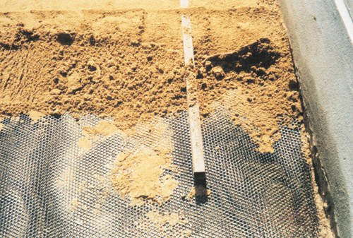 Armeringsnettet udlægges, og der køres sand på. Sandet vibreres og afrettes, således at