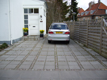 Etablering af en fremtidssikret flisebelagt indkørsel: For at undgå sætninger i indkørslen, stabiliseres underlaget med et armeringsnet – EXPO-1211 ”L” i hele indkørslens bredde.