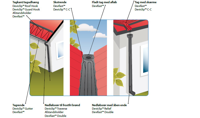 Læs mere i brochuren “Frostbeskyttelse af tage og tagrendesystemer” på DEVI’s udstilling eller på DEVI’s hjemmeside.
