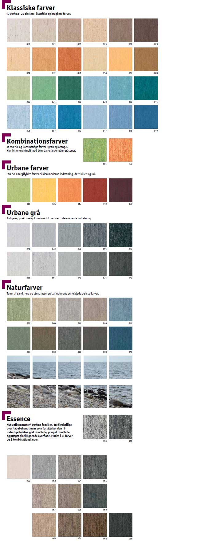Findes i 64 farver, hvilket gør iQ Optima til et perfekt valg til hospitaler og skoler Der findes også farvekoordinerede løsninger til forskellige funktionskrav: akustik, skridhæmmende og vådrum.