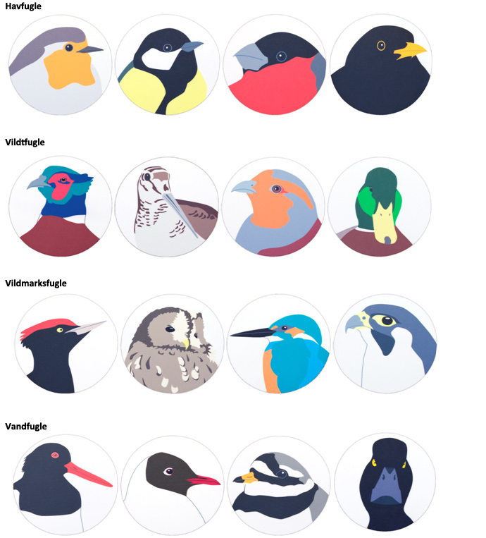 Glasunderlagene sælges i fire forskellige sæt og beskytter bordet eller dugen imod væskepletter. De kan aftørres og leveres med en robust melaminoverflade. Hvert sæt er emballeret i en displaykarton med vindue og er en oplagt gaveidé. De prydes af fugle formgivet af Ann Nyström og er en del af designsamarbejdet mellem Wildlife Garden og Ann Nyström. Vildtfugle til den jagtinteresserede, vandfugle til sommerhuset, vildmarksfugle til ornitologen og de populære havfugle til haveentusiasten.
