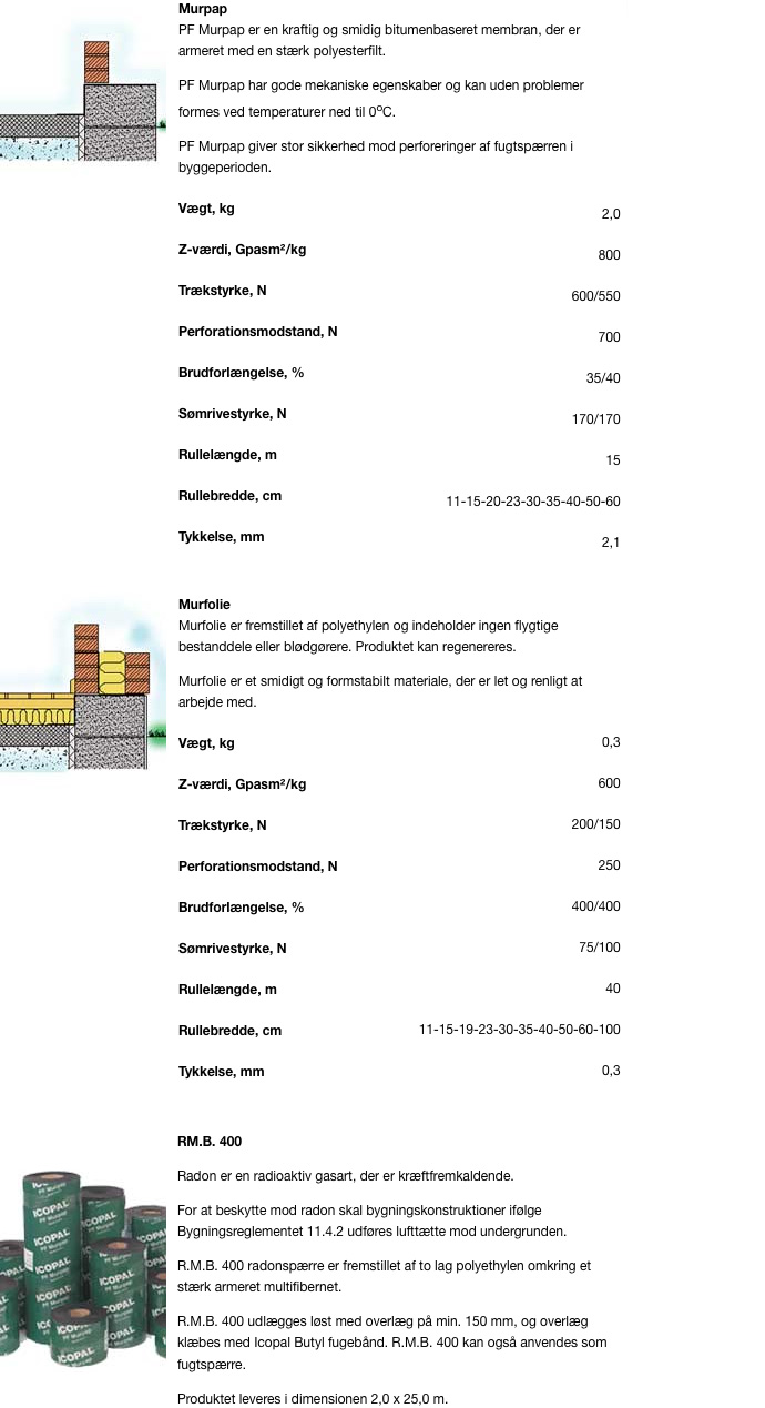 De fleste bitumen- og plastprodukter kan anvendes mod radon, men typisk anvendes Murpap eller Murfolie ved fundamentet og R.M.B 400 på selve dækket.