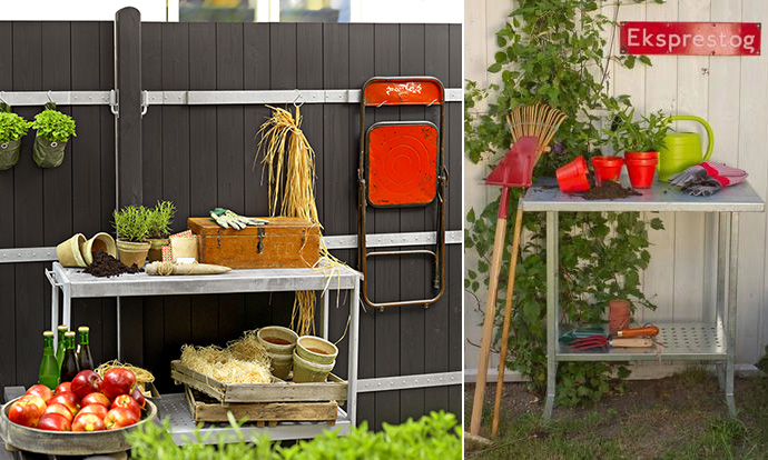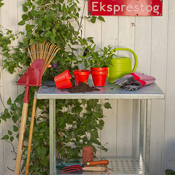 Når du indretter den udendørs arbejdsplads, så tag udgangspunkt i funktionen og tænk på samme måde, som når du skal indrette et køkken. Omdrejningspunktet er et godt arbejdsbord. Højden skal være ca. som et køkkenbord. Et terrassebord er for lavt, og vil give en helt forkert arbejdsstilling. Det er rarest, hvis bordet er forankret op af en væg. Både fordi det skaber læ, og fordi det giver mulighed for at hænge ting op og udbygge med hylder og ophæng.