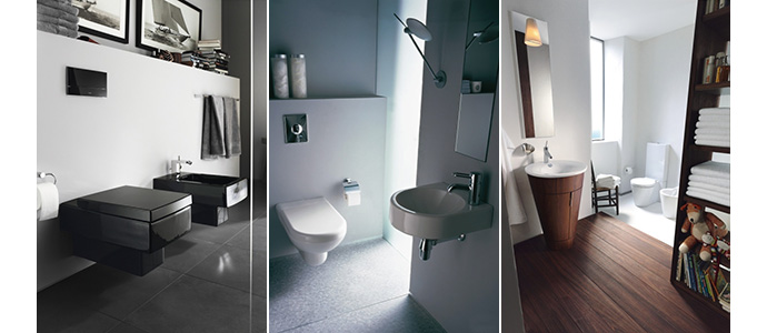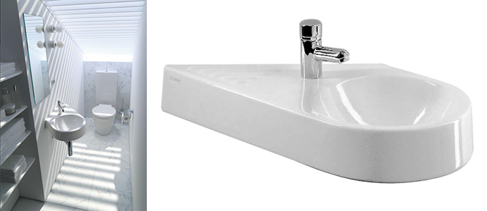 Duravit tilbyder også ekstreme smalle vaske til små badeværelser eller rum med skrånende loft: den diagonale Architec vask med integreret porcelænshylde, Happy D. vasken der kun er 25 cm dyb eller en Vero vask der er 25 cm bred men hele 45 cm dyb.
