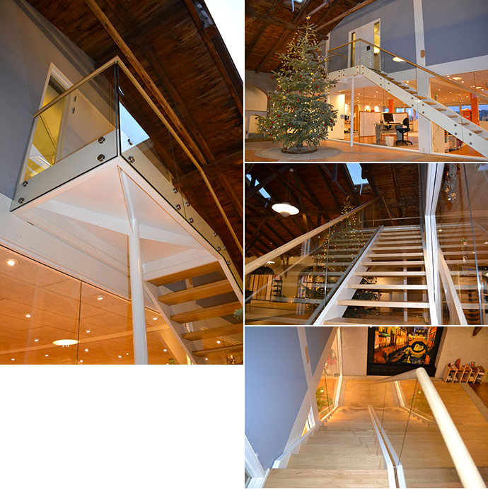 WOOD STEP har fået lavet sig en gedigen trappe med åbne trin og glasværn, hvidolieret trin og håndliste i eg der passer til gulvet og som også passer perfekt ind i deres udstillingslokales unikke rammer.