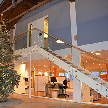 Om trappen siger Keld Jensen, Timbermann “I forbindelse med etablering af ny trappe fra vores udstilling til fælles faciliteter på 1. sal søgte vi en løsning, der kunne matche vores unikke udstillingsbygning, og samtidig udfylde det praktiske formål, at forbinde udstillingen med fælles faciliteterne på 1.sal. WOOD STEP har på fornemste vis løst begge opgaver til vores fulde tilfredshed. Trappen er flot og gedigen, og opfylder alle vore behov.”