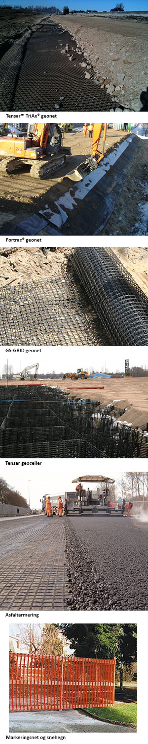 Ved anvendelse af geonet i anlægskonstruktioner forøges bæreevnen betydeligt, og det betyder, at der kan spares på grusmaterialet, transportudgifter og tid.