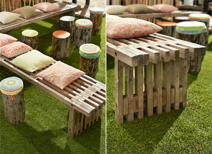 Se de spændende detaljer, som træstubbene med de søde hæklede siddepuder. Det er en hyggelig løsning f.eks. omkring bålpladsen, eller rundt omkring i haven på særlig udvalgte steder med en god udsigt.