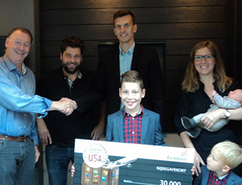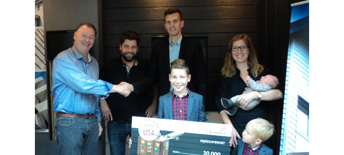 Kristian og Line modtager her sammen med deres 3 børn gavekort til deres USA-rejse. En spændende oplevelse, som familien glæder sig meget til at få sammen. Gavekortet overrækkes af Nils Primdal, James Hardie og Henrik Max Rasmussen, Cembrit. Vi ønsker rigtig god rejse!