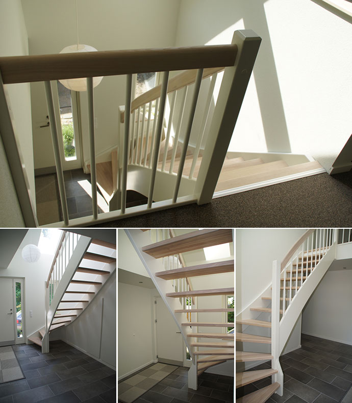 Det er en smagssag om man ønsker en åben eller en lukket trappe. En åben halltrappe giver et let indtryk, samt mere dagslys ind i rummet fra vinduerne.