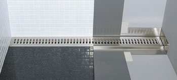Billedtekst: Unidrain’s linjeafløb installeres med fald i én retning ind mod væggen, hvilket reducerer risikoen for, at vandet ledes de forkerte steder hen.