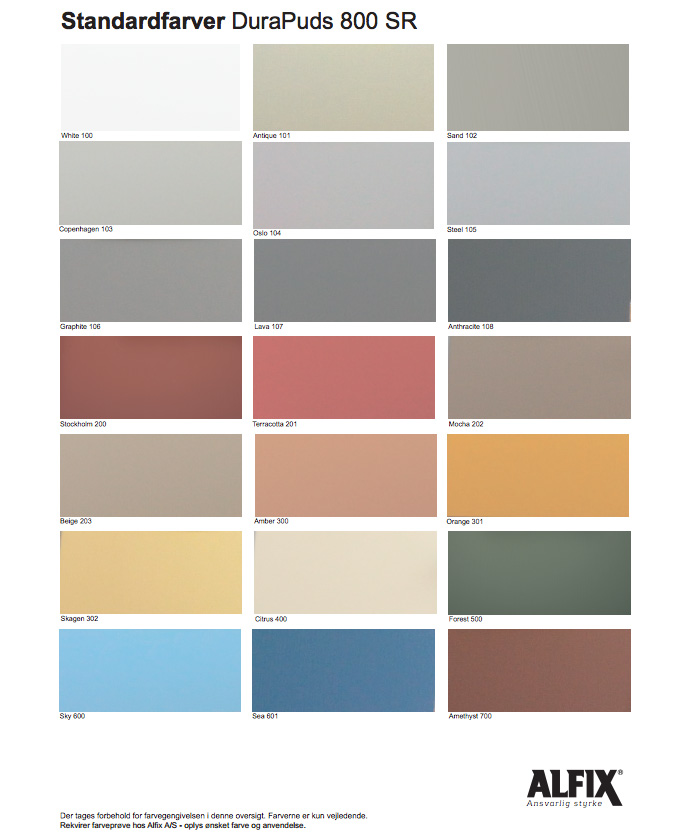 Alfix DuraPuds 800 SR er en hvid færdigoprørt slutpuds på basis af silikoneharpiks med en kornstørrelse på 1,5 mm og en konsistens, der gør den meget nem at arbejde med for den udførende håndværker. Leveres i hvid i 15 liter i flot grå genbrugs-plastspand. Kan farvetones.