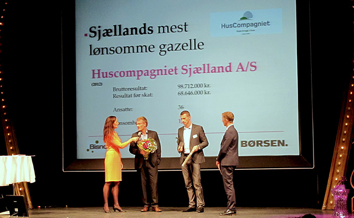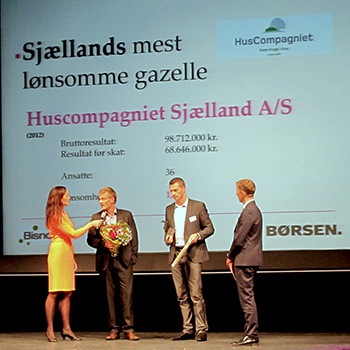 HusCompagniet har på trods af svære markedsbetingelser de seneste årformået at placere sig helt i front blandt samtlige vækstvirksomheder på Sjælland målt på lønsomheden. For de bedrifter modtog HusCompagniet sidste år Dagbladet Børsens pris som “Mest lønsomme Gazelle i Region Sjælland” – og i dag er kunststykket på imponerende vis blevet gentaget.