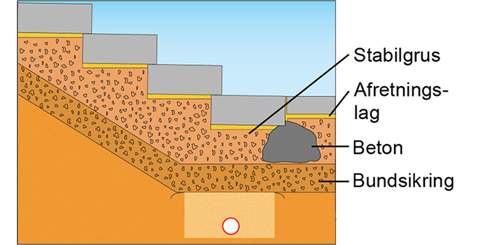Opbygges en trappe med betontrappetrin skal der opbygges en underbund med et bundsikringslag, et lag stabilt grus og et lag afretningsgrus.