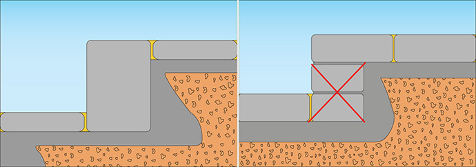Stødtrin bør laves af sten som står på højkant, da der er meget høje krav til vandrette fuger for at de ikke knækker og dermed ødelægger trappen.