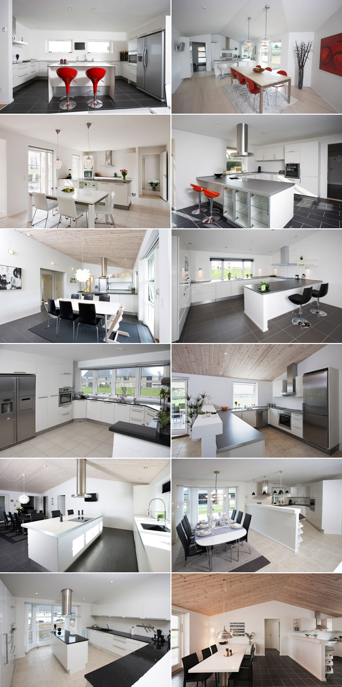 Køkken/alrummet i HusCompagniet huset kan indrettes på mange forskellige måder: Ikke bare med eller uden spisebar. Vi giver jer også frihed til at vælge karnapper, flade eller skrå lofter, ovenlys og meget mere.