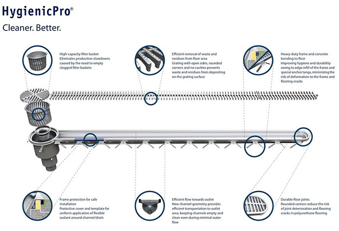 HygienicPro® er professionelle punktafløb og render, som sikrer effektivt flow og et højt niveau af selvrensning, er lette at rengøre og forebygger bakterievækst, samtidig med at de også begrænser vandforbrug og produktionsstop til drift og rengøring af afløbssystemet.