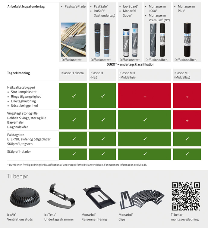 ICOPALSs undertagsprogram omfatter en række forskellige, fritspændende banevarer samt naturligvis den traditionelle – og teknisk optimale – løsning med ICOPAL tagpap på brædder eller krydsfiner. Produkter, der tilsammen dækker alle behov for en effektiv og tæt undertagsløsning. Sortimentet omfatter såvel diffusionstætte som diffusionsåbne undertage.