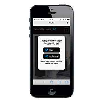 Når du taster ifo.dk på din mobil, bliver du spurgt, om du er privat eller professionel. Dit valg gemmes, og du kan nu vælge at gemme ikonet på din mobil – så er du altid opdateret på Ifös produkter.