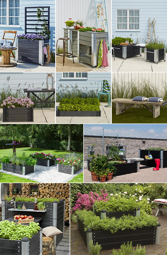 Rundt omkring dine borde og bænke eller ved dit udekøkken, kan du sætte PLUS blomster- plantekasser og højbede til forskellige formål. Nogle som blomster/grønsags rumdeler, nogle med bordplader til bordgrillen, og nogle med bænke imellem til en lille pause og nogle der bare er fyldt med smukke og frodige planter der kan fornøje dit øje. Med lidt højde på planterne eller med et espalier kan du hurtigt få dannet et hyggeligt rum i haven.