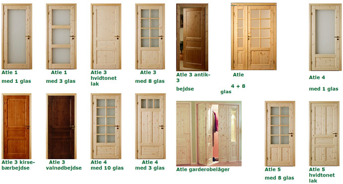 Vælg imellem typerne fyrretræ, egetræ, malet og knastfri fyrretræ. – ubehandlet, lakeret eller bejdset/lakeret. Klik på navnet eller dørpladen for at se flere udformninger af samme dørtype.