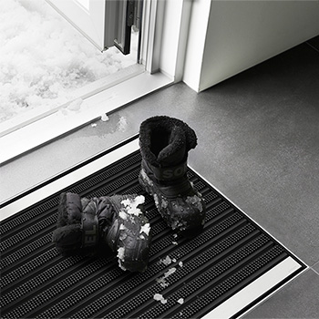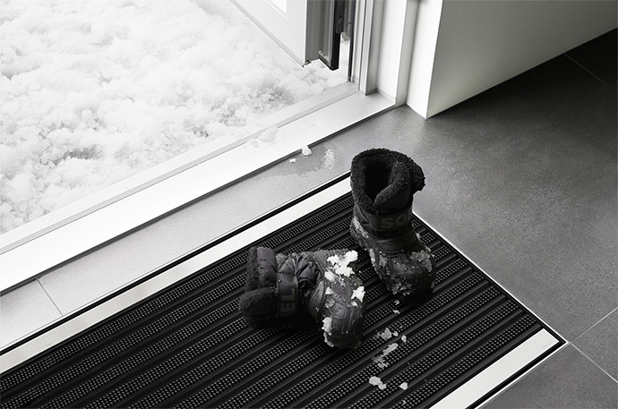– Systemet fjerner effektivt skidt, småsten og grus fra fodsålerne og leder vand væk fra trædefladen og ned i trævlesien og afløbet nedenunder. Måtten er omsluttet af en slank stålramme, som er støbt ned i gulvet, hvilket forhindrer den i at rutsje rundt. Den kan installeres i alle hustyper og gulvkonstruktioner med fliser og fås enten med slidstærk gummibelægning eller UV- og kemikalieresistente nylonbørster.