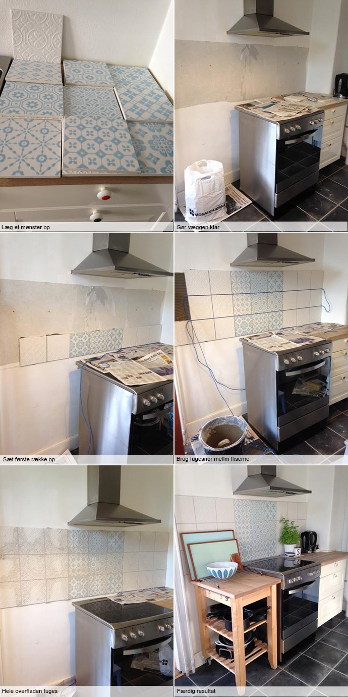 Første step var, at bestemme hvilket mønster fliserne skulle sætte op i, og det var helt vildt svært at bestemme sig, men efter at have afprøvet både skaktern og rækker, bestemte jeg mig for farvefirkanter.