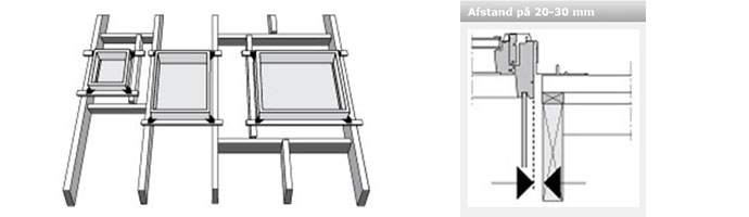 Af hensyn til isolering bør ovenlysvinduer monteres med en afstand på 20-30 mm fra spær/afstandsliste til sidekarmene. Se tegningen til højre.