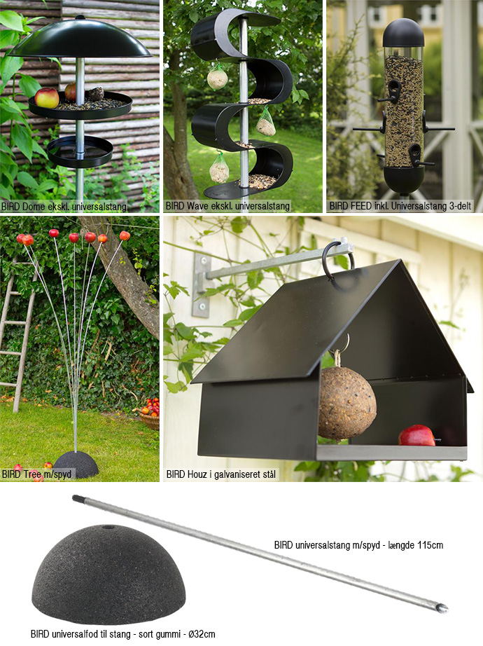Bird Wave – udformet som en lang, lodret bølge, der svinger sig ned over fuglehusets stang. Det særligt bølgede udtryk giver flere flader til at forsyne havens fugle med forskelligt foder, og krumningerne i sort styren er udviklet til at beskytte maden, når blæsten raser.