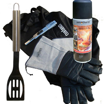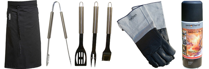 Måske med et par Lækre Nielsen BBQ grillhandsker med fingre i, så du kan få godt fat. Eller et skønt Nielsen BBQ-forklæde, og måske et nyt skønt værktøjssæt i bedste kvalitet.