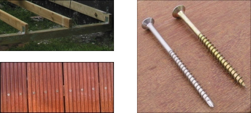 Planker kan skrues fast oppefra eller nedefra, hvis man ønsker skruerne helt skjulte. En anden måde at skjule skruerne på, er ved at proppe dem/ montere træpropper i skruehullerne. Uanset metode, bør der monteres min. 3 skruer pr. fæstningspunkt, idet der ellers er stor risiko for, at træet buer på midten ved visse vejrforhold.
