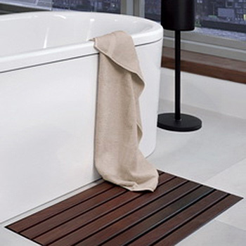 Løsningen er en unik kombination af en opsamlingsbakke og en gulvrist i vandskyende olieret træ. Løsningen sørger for at overskydende vand/vanddråber ledes direkte i opsamlingsbakken, og gulvvarmen sørger for at vandet fordamper.