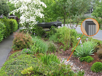 For at øge bedets vandkapacitet eller for at tilpasse vandmængden til de aktuelle planter, kan der etableres BIO-BLOK® faskiner i selve bedet eller uden for bedet til at modtage de ekstra store vandmængder, der vil forekomme.