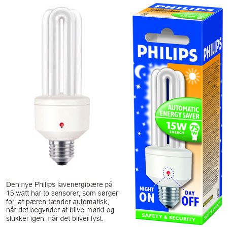 En ny Philips-lavenergipære med to sensorer sørger for, at pæren tænder automatisk, når det begynder at blive mørkt og slukker igen, når det bliver lyst. Derfor behøver du ikke et tænd- og slukur, som hele tiden skal ændres i takt med, at dagen bliver kortere eller længere.