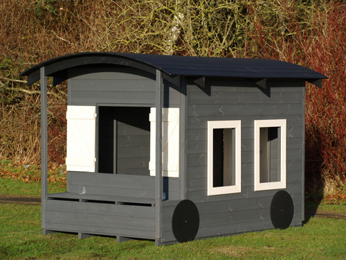 Togvogn fremstillet i ubehandlet tørret nåletræ. Grundmål: 140×222 cm. Heraf købmandsbod og bænk/opbevaringsbox: 140×35 cm. Kiphøjde: 167 cm. Sidehøjde: 137 cm underkant stern til terræn. Beklædning: 15 mm fer/not opbygget på 44×44 mm revler. Spær: 25×90 mm limtræsbuer. Dør: 60×151 cm. Vindue: 2 stk. 35×35 cm uden glas.