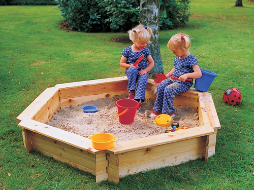 6-kantet sandkasse til privat brug. Kan fåes med 2-delt låg.