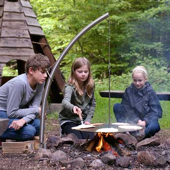 Jordspyd fra Nielsen Outdoor Solutions med arm forvandler lejrbålet til dit lille udekøkken. Nu kan du stege, koge eller endda bage over bålet.