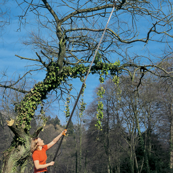 Når træernes top og hækkens vildfarende grene skal beskæres, må haveejeren ofte stå på en vakkelvorn stige, mens reb og sav udgør våbnene i kampen mod de øverste grene.