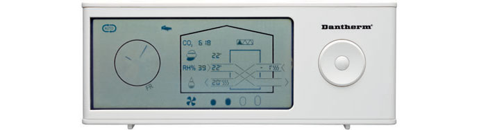 Til Dantherm boligventilationsanlæg fås en nem og funktionel fjernbetjening, der giver brugeren adgang til en lang række ekstra funktioner udover dem, som kan klares med det standard kontrolpanel. Fjernbetjeningen er i et pænt og tidløst design som kan ligge fremme på bordet eller hænges op på væggen. Den giver bl.a. adgang til valg mellem 12 ugeprogrammer, aktivering af bortrejst funktion, natsænkning, brændeovnsfunktion, aflæsning af aktuelle temperaturer for ind- og udblæsningsluft, luftfugtighed og CO2-værdier.